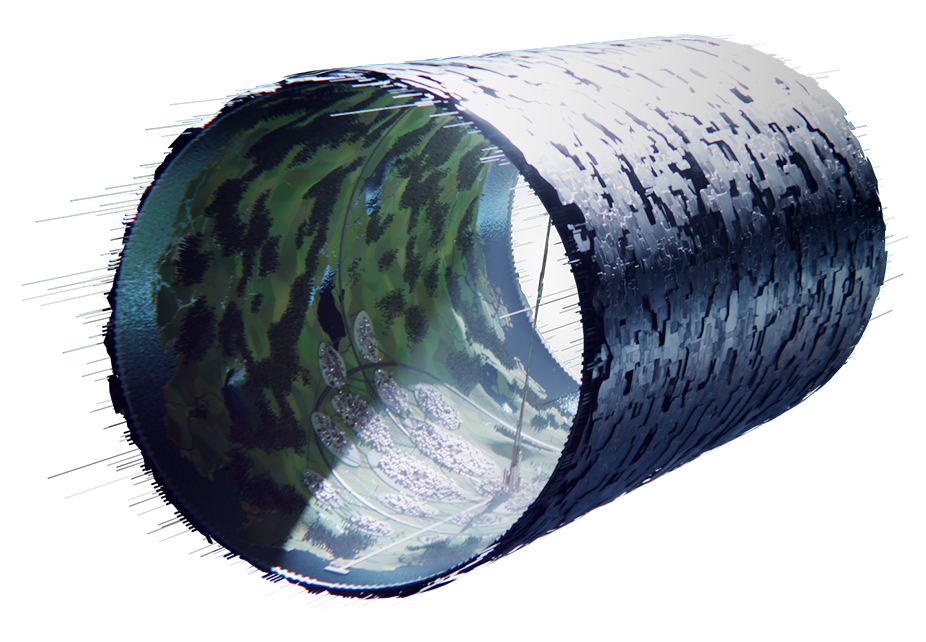 Heavenland is a futuristic city built in a rotating gravitational cylinder in the Earth’s orbit. Negative surface curvature imparts Heavenland citizens with other world experiences, and its location in space makes Heavenland a true space gateway.
