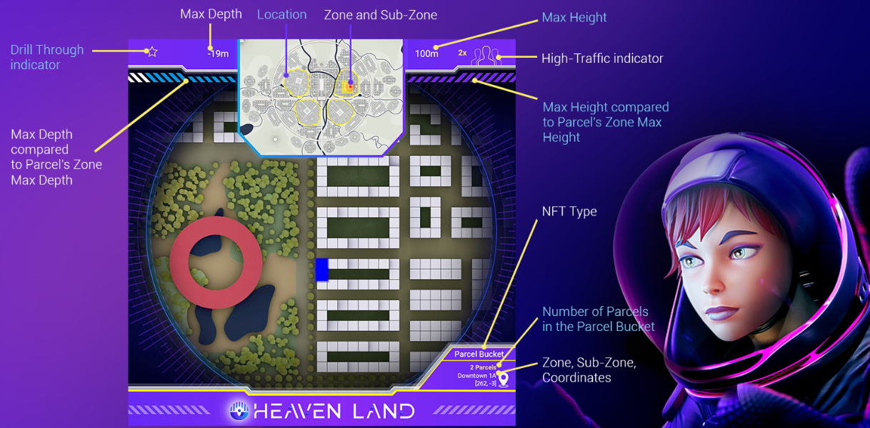 Parcels are the most critical NFTs in Heavenland; Parcel Buckets describe the state when the Parcel owner merges two or more adjacent Parcels to create a larger, continuous block. Parcel Bucket should impart the individual Parcels with superior qualities, including supporting more prominent buildings (in height, depth and area) and increasing staking opportunities.